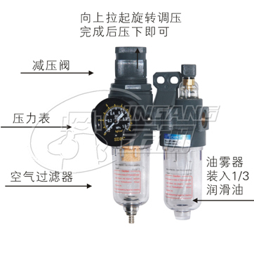 該氣源處理三聯(lián)件包括空氣減壓閥,過濾器、油霧器三大件。其中威壓閥可對氣源進行穩(wěn)壓,使氣源處于恒定狀態(tài),可減小因氣源氣壓突變時對閥門或執(zhí)行器等到硬件的損傷。過濾器用于對氣源的清潔。可過濾壓縮空氣中的水分,避免水分隨氣體進入裝置。油霧器可對機體運動部件進行潤滑。可以對不方便加潤滑油的部件進行潤滑,大大延長機體的使用壽命。o